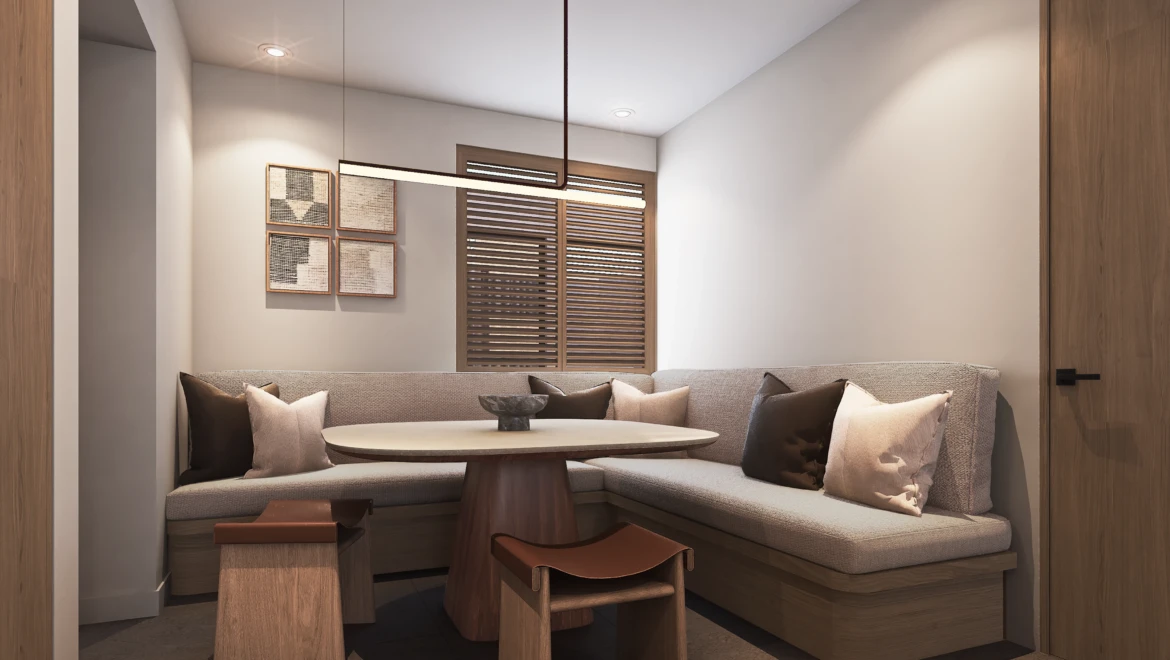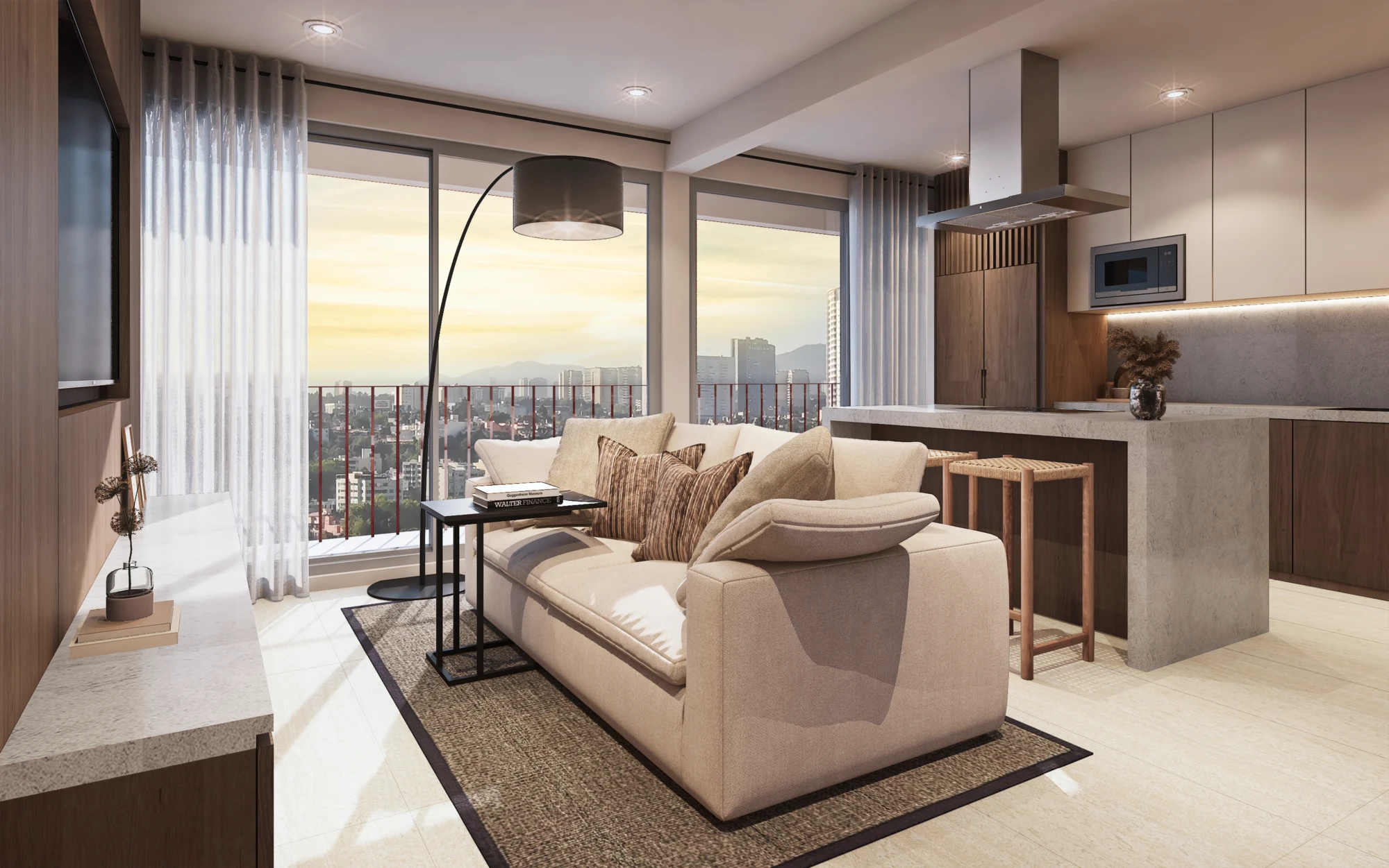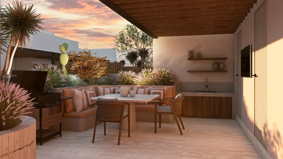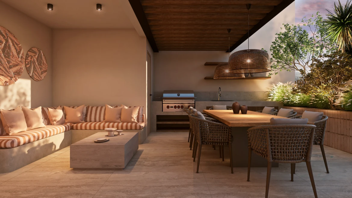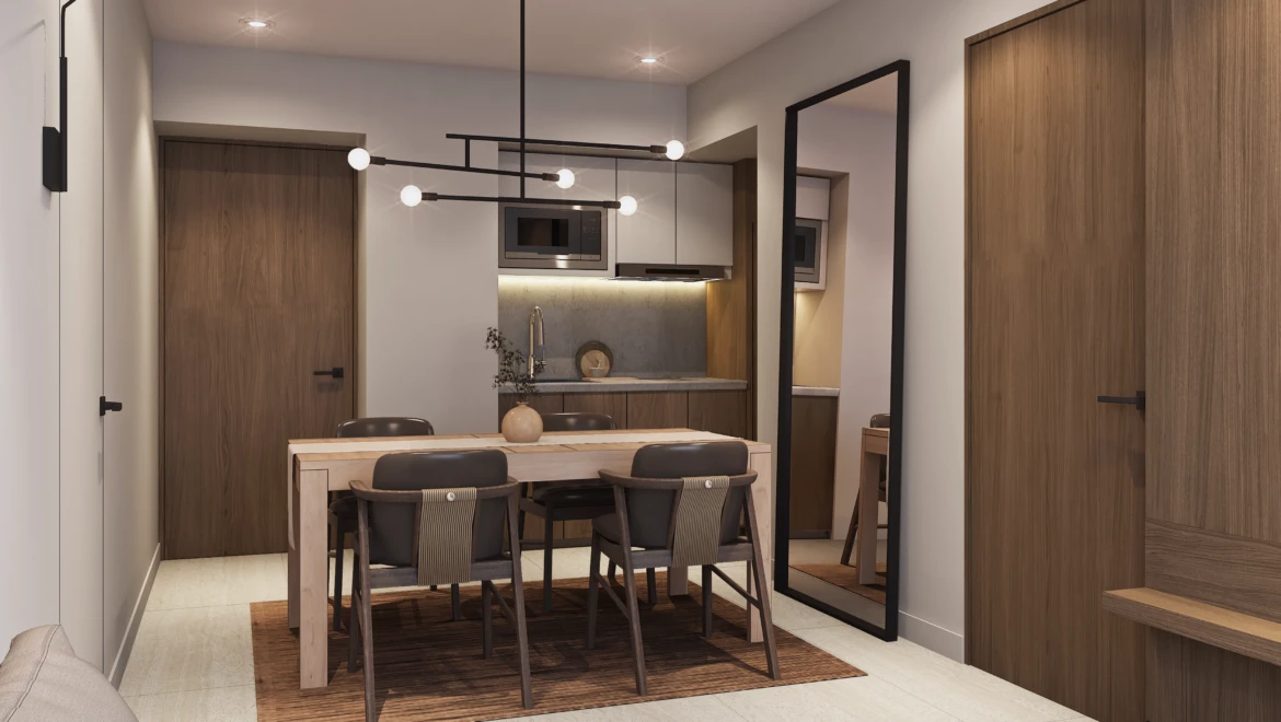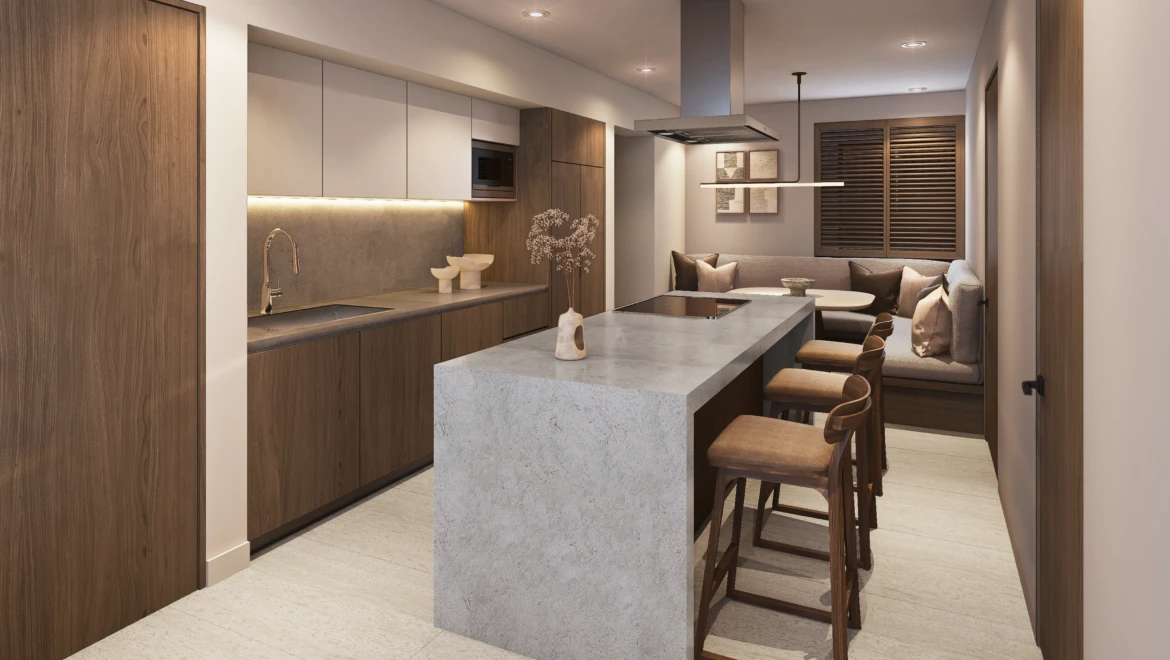 En acabados, destaca porcelanato tipo mármol en áreas sociales, pisos de ingeniería en recámaras, carpintería en MDF hidrófugo con diseño en nogal y cubiertas de cocina de alta especificación, pensados para brindar elegancia y durabilidad