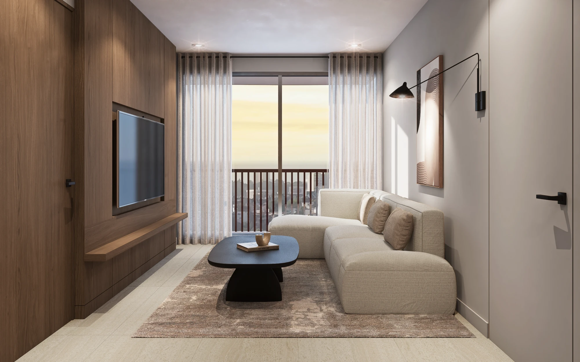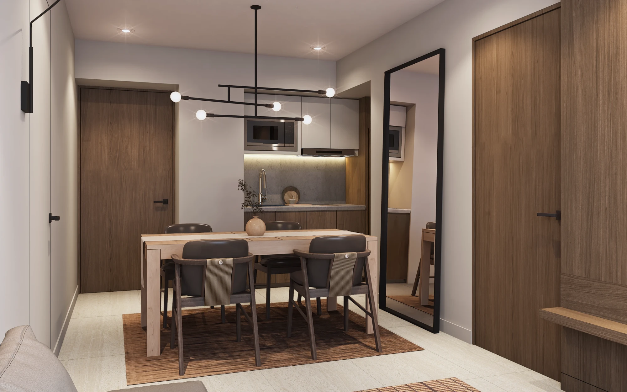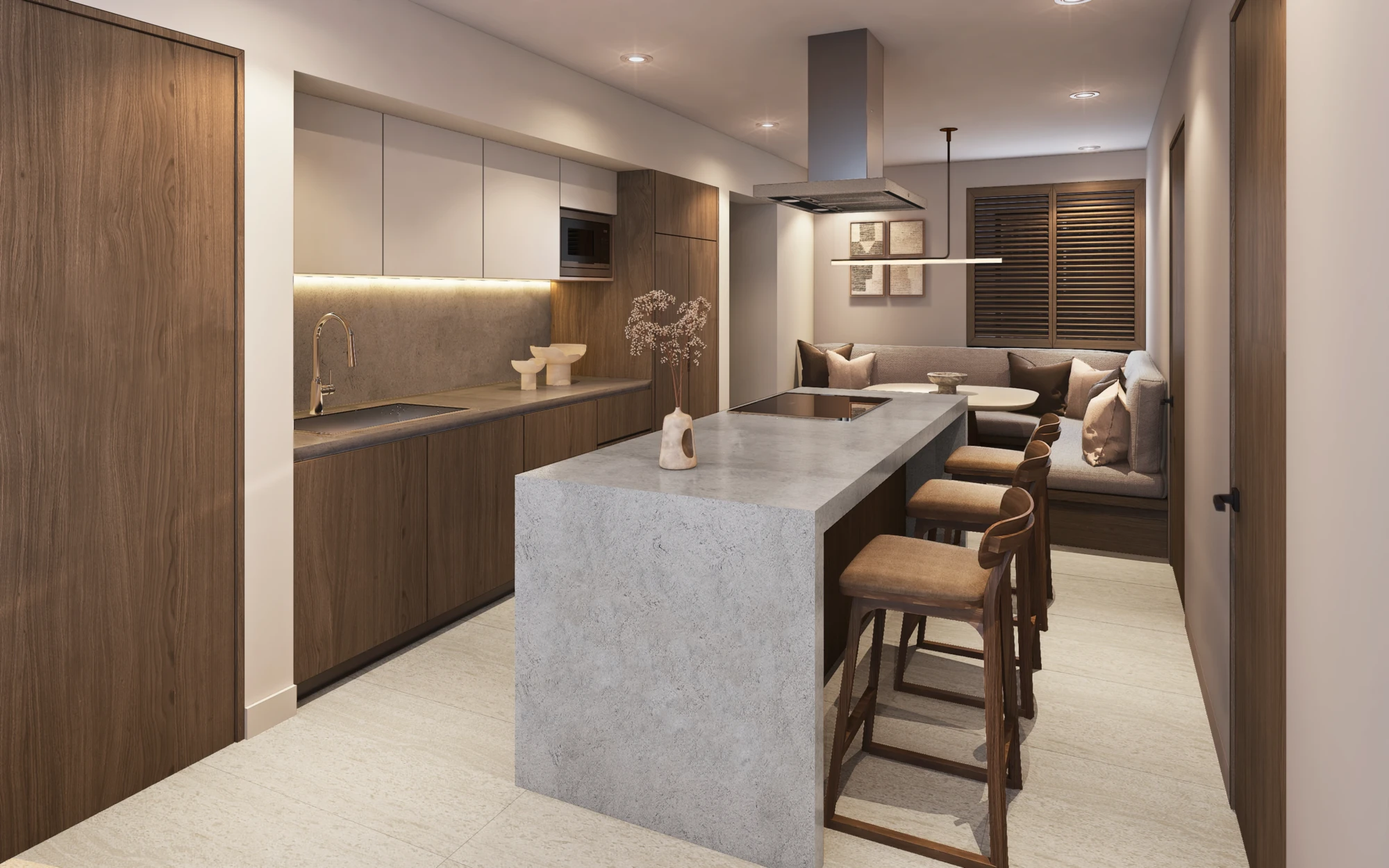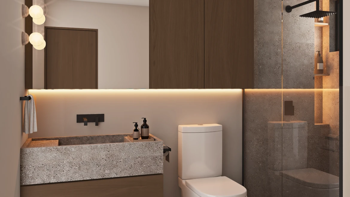 En acabados, destaca porcelanato tipo mármol en áreas sociales, pisos de ingeniería en recámaras, carpintería en MDF hidrófugo con diseño en nogal y cubiertas de cocina de alta especificación, pensados para brindar elegancia y durabilidad