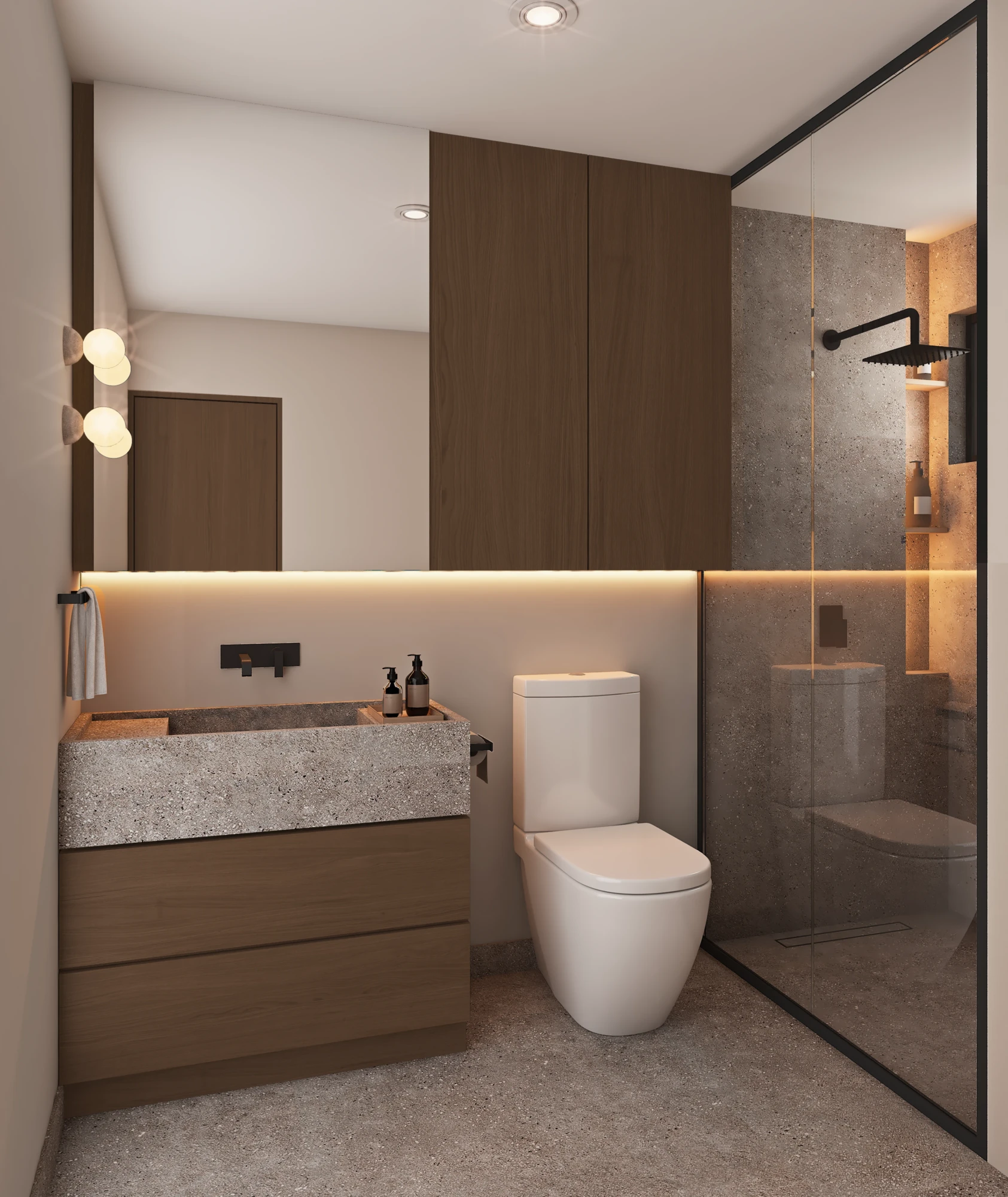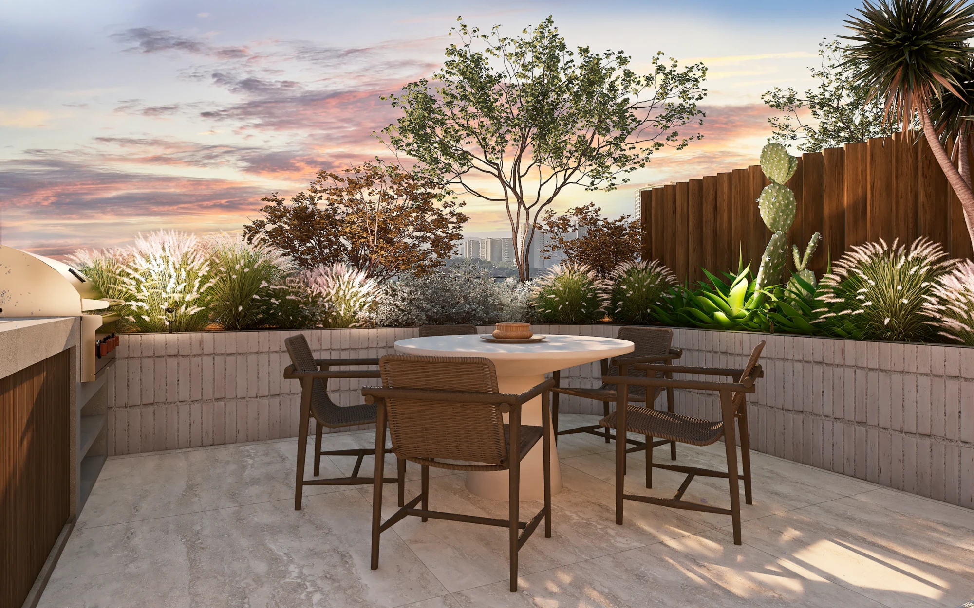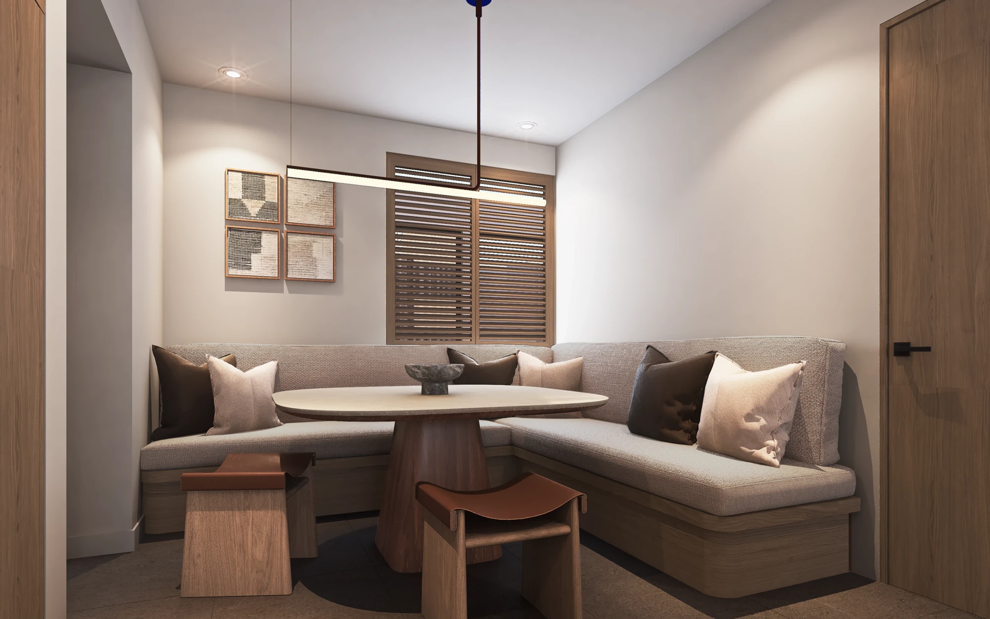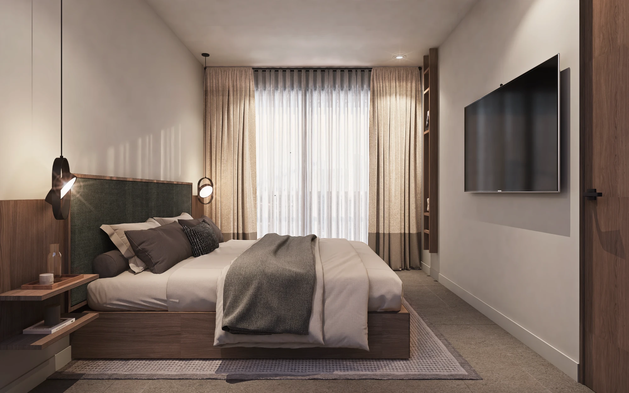 En acabados, destaca porcelanato tipo mármol en áreas sociales, pisos de ingeniería en recámaras, carpintería en MDF hidrófugo con diseño en nogal y cubiertas de cocina de alta especificación, pensados para brindar elegancia y durabilidad